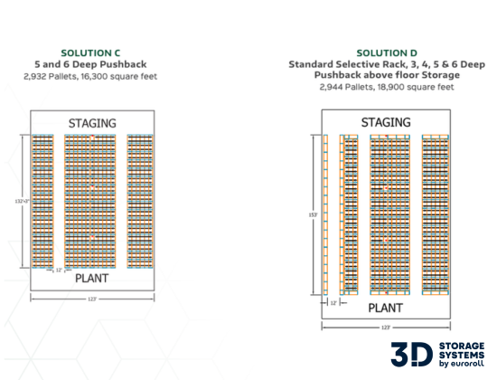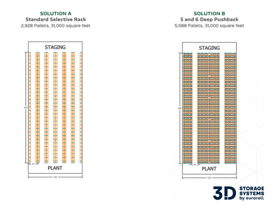 In one example, a conventional selective rack layout stores 2,928 pallets in a 31,000 square foot building. In another, a pushback solution using 5 and 6 deep lanes stores 5,588 pallets in that same 31,000 square feet. In a third example, a pushback system stores roughly 2,932 pallets in only 16,300 square feet. A fourth example shows a mixed solution with selective rack, pushback, and floor storage delivering approximately 2,944 pallets in 18,900 square feet.